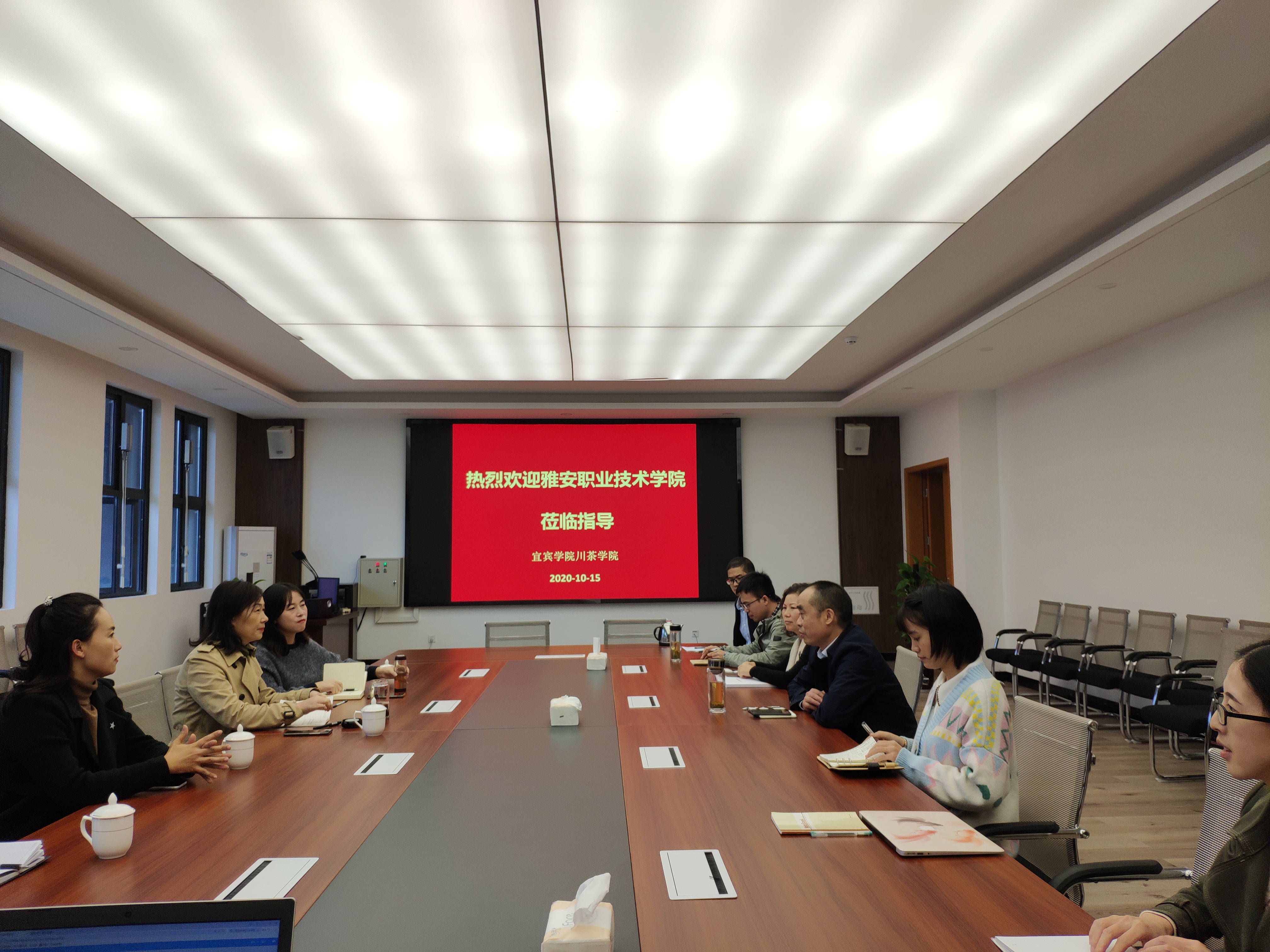 随后,调研组对宜宾公司川茶公司实训室进行了调研,并在宜宾公司川茶公司、宜宾市茶产业研究院开展了座谈会。会议由黄彤经理主持,会议开始,黄彤经理对公司专业建设、专业成效、教学与科学研究、人才培养等进行了详细的介绍。而后,赵先明部长就川茶公司在学科融合建设、校企深度融合、产教融合园区建设等方面的经验进行了分享。杨洪媛书记介绍了雅职院的基本情况,并表示此次调研取得了很大的收获,川茶公司发展的成绩有目共睹,同时针对如何深化雅安茶产业产教融合、校企合作等问题与赵先明部长、黄彤经理及各位参会老师进行了积极讨论。会议最后,杨洪媛书记表示蒙顶山茶产业公司在探索产教融合、校企合作的道路上需要更多的学习与合作,同时对川茶公司对于蒙顶山茶产业公司建设提出的意见和建议表达感谢。