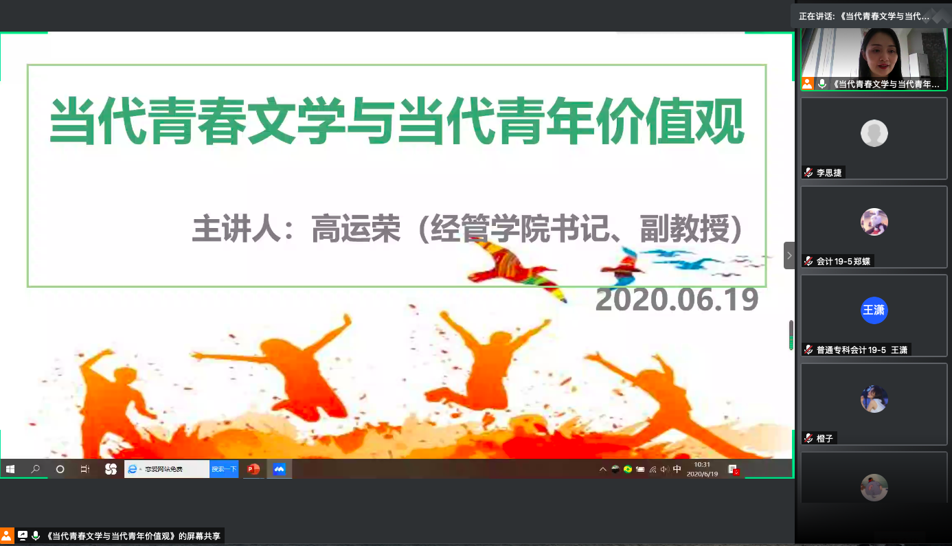 为贯彻落实《中共304永利集团登录入口委员会党校2020年度培训计划》,6月19日上午10:30——12:00,公司党支部书记高运荣副教授在线上开展了以“当代青春文学与当代青年价值观”为主题的“固本培根”培训讲座。304永利集团登录入口入党积极分子、党组织发展对象、员工会干部、干事等约200名同学参与此次讲座。