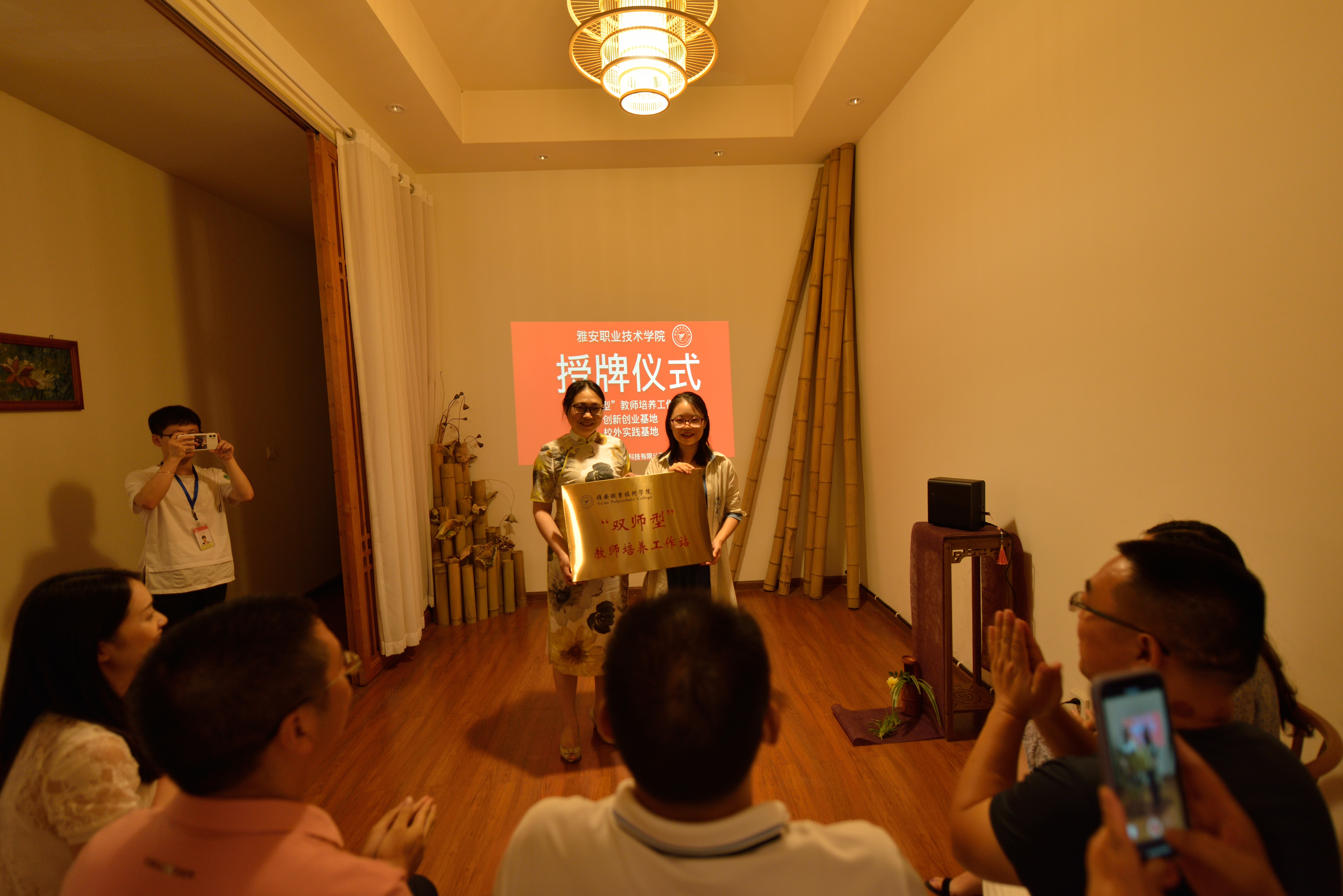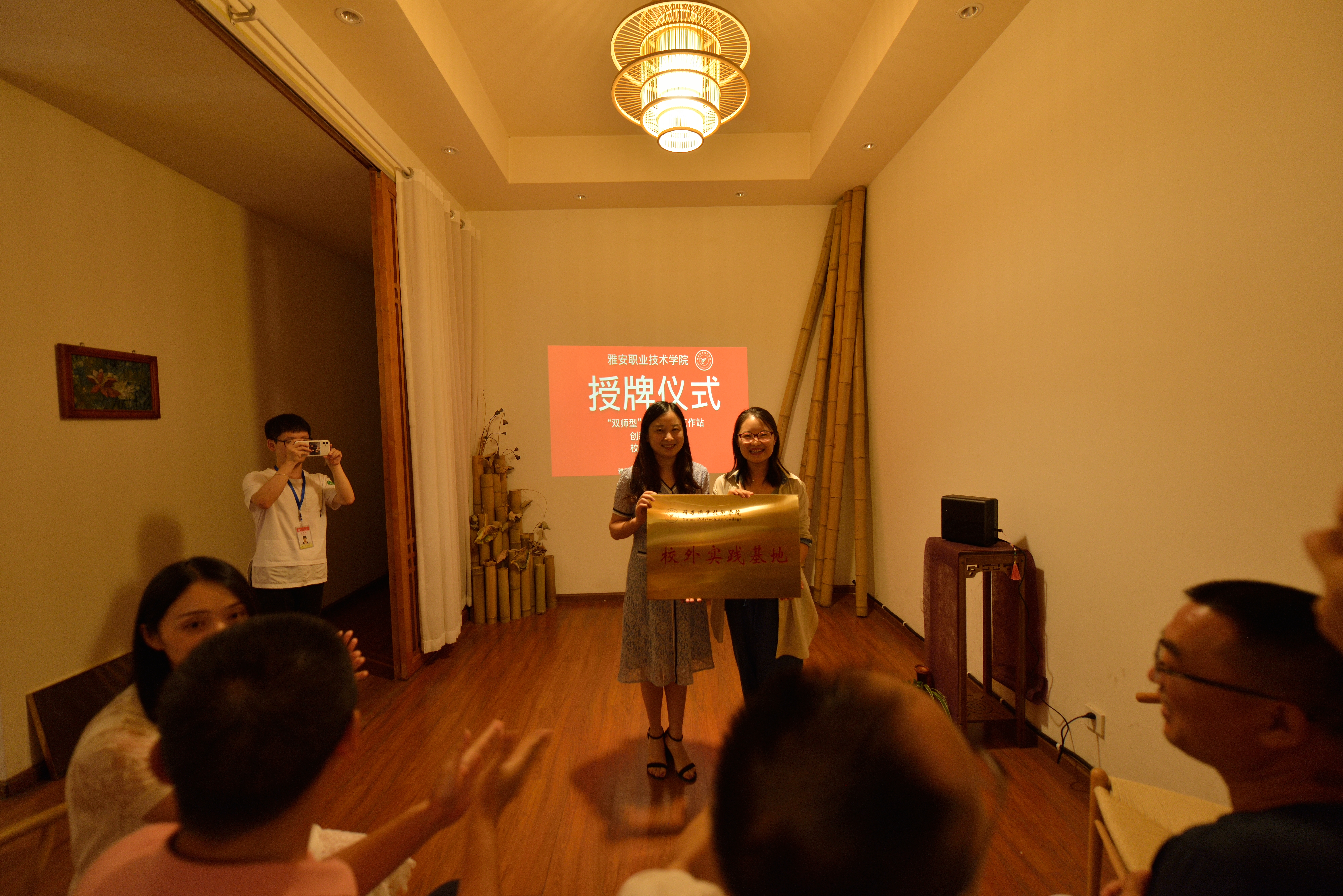 交流会的最后举行了授牌仪式。夏安琼、高运荣、李柚分别给雅安国色茶叶有限公司授牌了“双师型”教师培养工作站、创新创业基地、校外实践基地。
