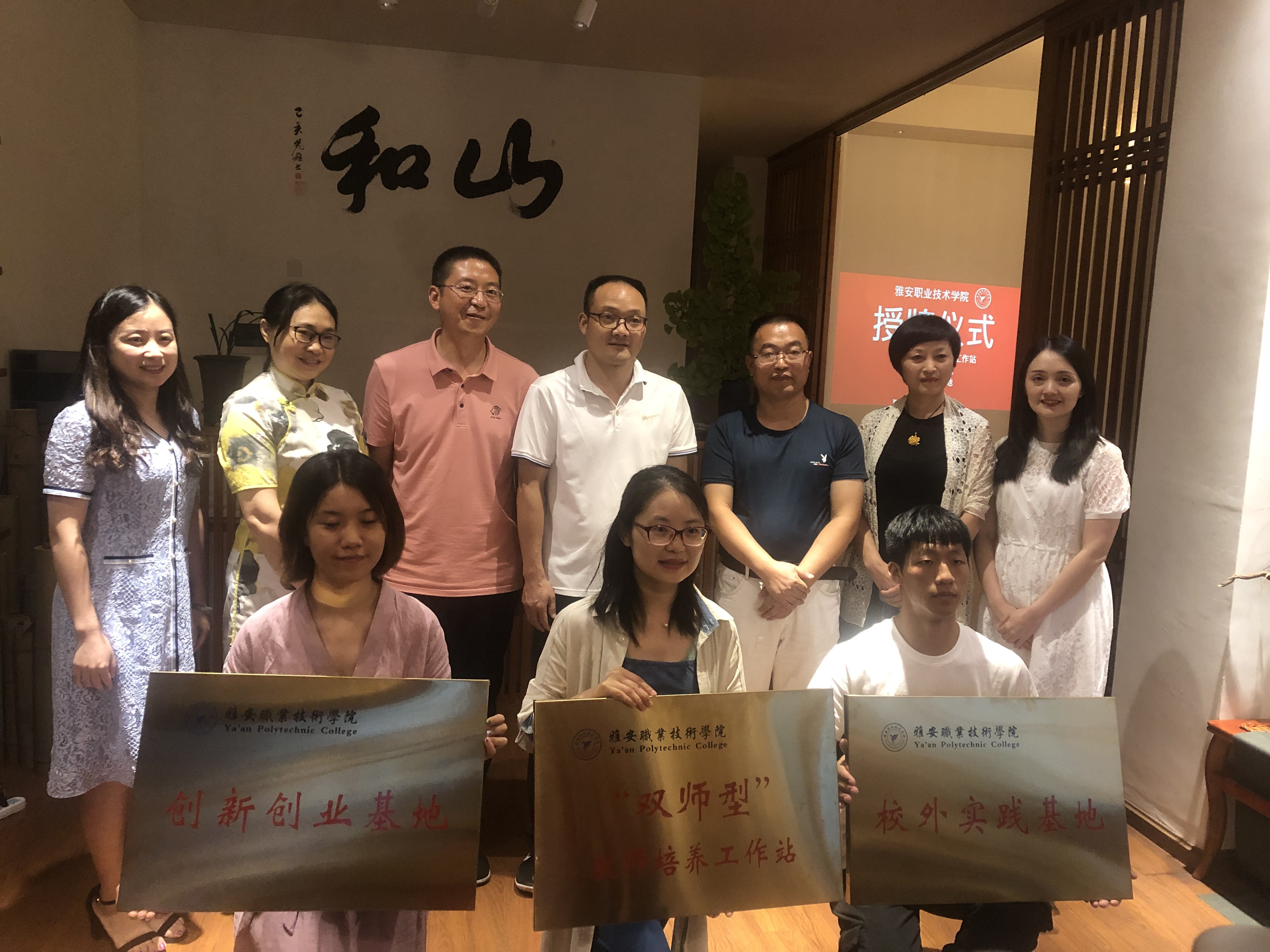为深化产教融合,推动双师型队伍教师队伍建设。7月30日下午,雅安职业技术公司党委委员、副经理樊先茂带队前往名山雅安国色茶叶有限公司举行授牌仪式。雅职院组织部部长、人事处处长夏安琼,经管公司党支部书记高运荣、副经理李柚、专任教师蒋丹,名山区宣传部副部长代先隆以及工作人员参加了此次授牌仪式。首先,樊先茂为名山区的领导阐述了双师型教师和双师型素质教师的内涵和要求,提出双师型教师是高职教育教师队伍建设的特色和重点,大力加强“双师型”教师队伍建设,已经成为社会和教育界共同的呼声。并表示蒋丹老师是双师型素质教师的典型人才。随后,蒋丹老师给大家分享了开办雅安国色茶叶有限公司在引导员工创业,培养员工能力等方面的经验。接着李柚讲到,此次授牌选择雅安国色茶叶有限公司,是以青年教师走进行业、创办企业为案例,打造公司双师型教师发展的窗口,带动更多的年轻老师走出公司,走进企业切实提升双师素养。最后,夏安琼总结到,国家政策大力支持高职教师创新创业,立足专业、走进企业、融合创新创业是对现代高素质职业教师的新要求,希望地方政府可以多予以支持。