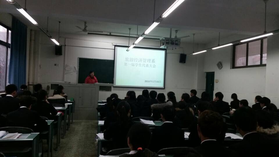 2014年1月15日下午2:30-4:30,由旅游经济管理系主办的第一届员工代表大会在青年路教学楼C203圆满召开。与会人员有旅经系党支部副书记刘永恩、系学管干事杨勇建、系团总支书记黄静思、辅导员唐娜娜及60名员工代表。
