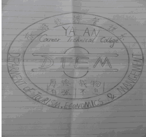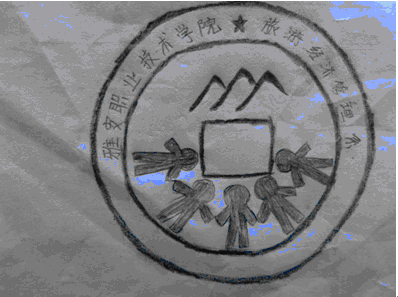 设计理念:徽章整体由一片茶叶、一个变形的“旅”字、一条变形的河流和校训形成。整体被一个圆圈包围,与校徽相照应形成徽章。一片树叶既象征着我系茶文化的特色又象征着我系全体师生,正如新芽一样生机勃勃,努力生长。一个变形的“旅”字被简化成两个在新芽下的人,寓意着咱们系是一个可以带领人们旅游,领略雅安风情的系。而变形的河流却是代着雅安的青衣江,与整体徽章的圆圈相呼应。